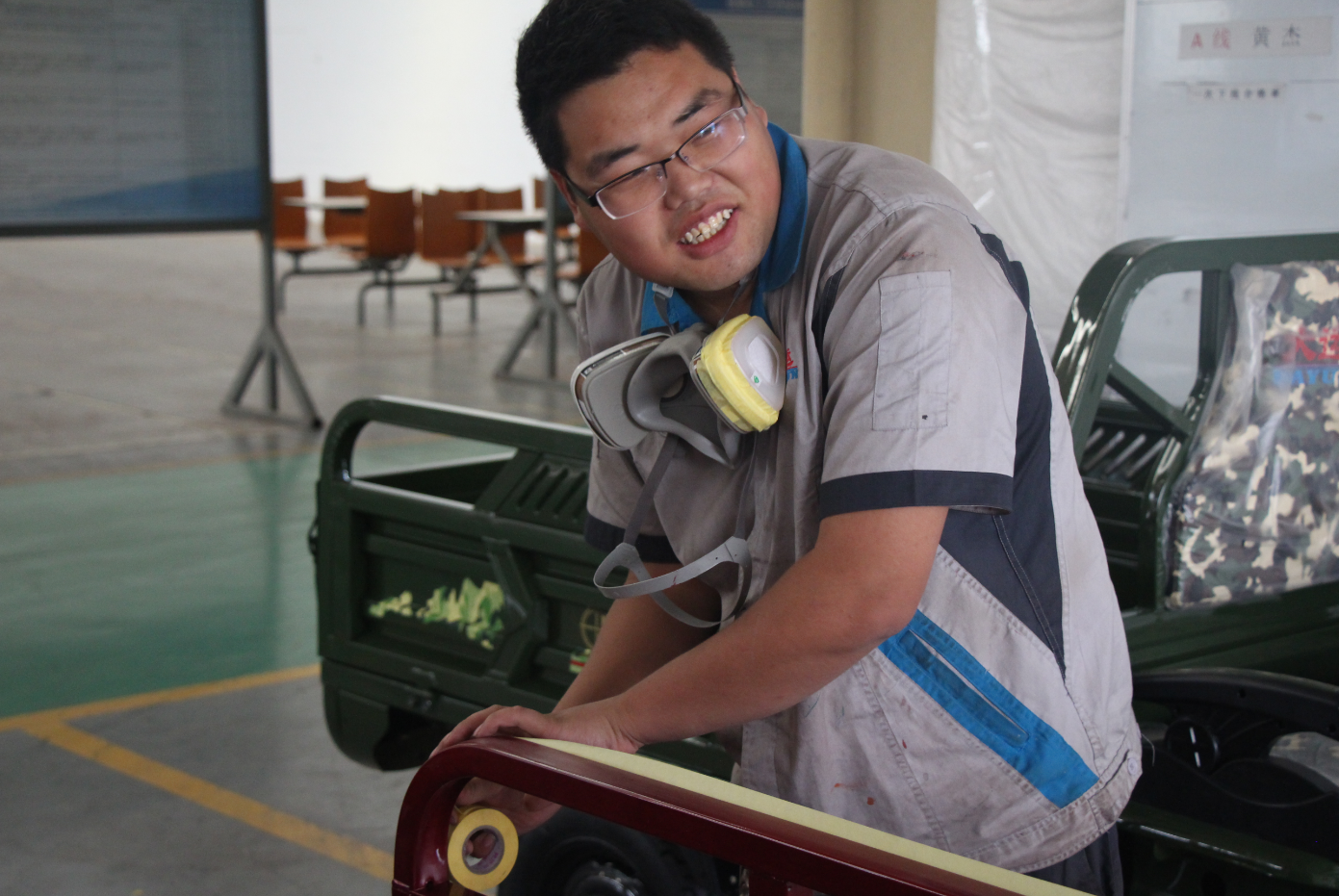 呂凱負責的工作是成車入庫前的最后一道工序。車輛裝配完成后會下線調試,調試完成后質保處進行檢驗,如果車輛沒有問題,直接入庫,如果有問題則要返修。但一般的返修流程都是總裝處修理完畢再轉入涂裝,所以以呂凱為主的補漆員需要配合總裝處調試區的工作時間,因為他要時刻保持通道暢通,保證車輛按時入庫。